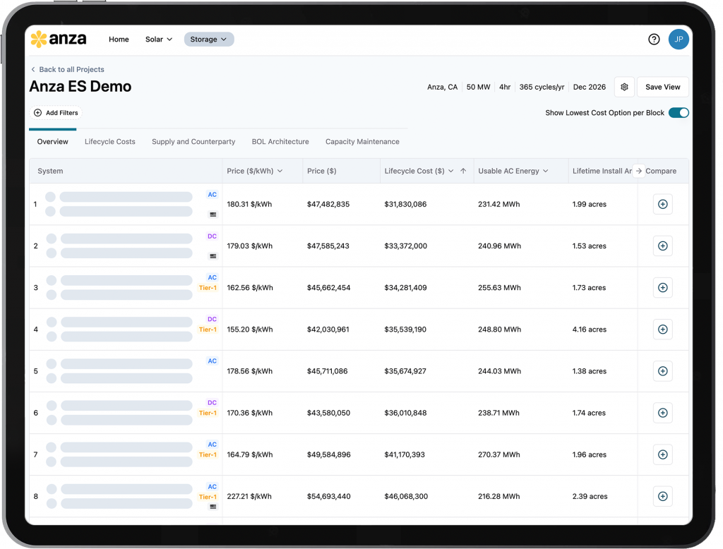 Our proprietary platform engine, coupled with our industry-leading database of cost, technical, trade risk, and commercial information, gives equipment buyers and developers the critical solar and energy storage data and analytics they need. Only the Anza platform provides rapid comparison tools, automated analysis, and rankings of solar module and BESS options by lifetime value, helping you to simplify processes, increase efficiency, and win more business.