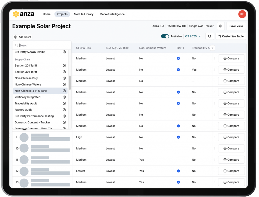 Narrow down the long list of available product options directly in the Anza platform to meet your project requirements. Easily hide or filter options using a wide range of data fields including product technical specifications, manufacturer information, and risk assessments, including our FEOC Risk Rating. With the most current direct-from-supplier pricing, availability, product specs, and documentation at your fingertips, you can find the solar panel data you need faster and use it easily.