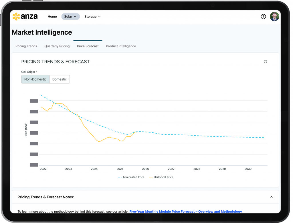 Gain unprecedented visibility into current and future module pricing during development, procurement, asset sale, or purchase. Our Predicted Quote tool enables you to see a negotiated price range, derived from recent anonymized quotes on comparable products. With Anza’s Predicted Quote data, buyers can achieve better economics and accelerate vendor negotiations. Plan for further out project development, PPA bids, and interconnection applications using a five-year monthly price forecast based on actual project quotes (not surveys and assumptions). This unique tool is created using machine learning models trained on a structured two-year dataset from 35+ suppliers, with 10,000+ verified platform price points.