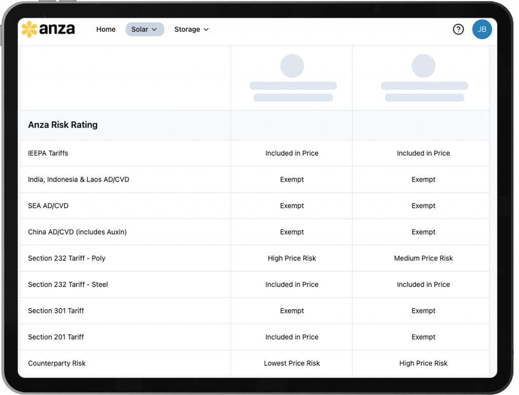Not sure which supplier options are the best choice to reduce unforeseen supply chain risks? Or having trouble tracking policy changes and collecting the intel you need for project planning? Navigate current market dynamics and stay up-to-date on the latest tariff, trade risk, and policy changes with Anza. Quickly view the key supply chain data fields necessary to assess FEOC compliance, tariffs, UFLPA, AD/CVD, and counterparty risk and find the best option to fit your risk profile. Filter for U.S. based manufacturing or assets and non-Chinese manufacturing and gain confidence in your product selections. Get the clarity you need if you plan to utilize the ITC with extensive FEOC data and tracking of supplier compliance plans.