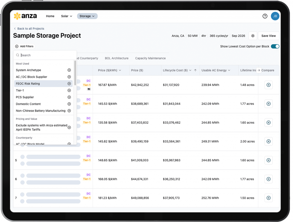 Gain access to in-depth direct-from-supplier technical and risk data for AC and DC block battery energy storage system options available with Anza. Our aggregated energy storage data includes technical specs such as ingress protection, corrosion, and seismic ratings, and certification and safety compliance filters to quickly gain confidence in products you are selecting for your development designs. Eliminate your manual data collection and battery sizing efforts and streamline your product evaluation processes with data at your fingertips.